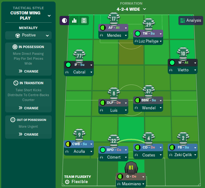 Here’s the 4-3-3 system I finished the season with. It generally works well away from home, where our hosts tend to play more expansive football. It’s also got us some impressive results against bigger teams like Benfica and Porto, who will attack us anyway and leave themselves more vulnerable at the back.