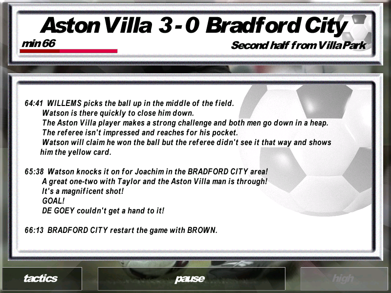 An even greater concern is that tactics and team strength don’t appear to have much bearing on results, which often seem erratic and random. My Bradford team lost 1-0 at home to Division 3 Swansea in the FA Cup, yet took draws at Old Trafford and Highbury, and also recorded a couple of wins over 3rd-placed Coventry.