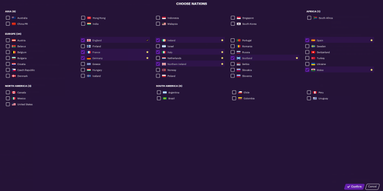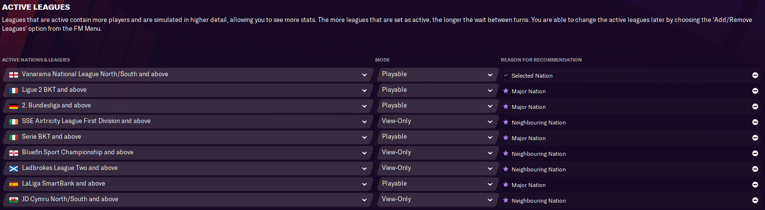 Alternatively, if you’re starting out in the English National League North/South and want a quicker game, you might only want the other British and Irish leagues loaded. If you’re managing a top team, consider adding just the major nations (England, France, Germany, Italy and Spain – and maybe the Netherlands, Portugal and Russia as well for more competition in Europe).