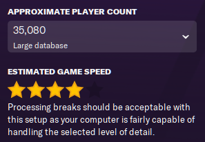 Under that number is a star rating out of 5, showing an Estimated Game Speed based on your game setup and your computer specs. I wouldn’t read much into this. This rating system seems to bug out if you have other programs loaded alongside FM – and like with player star ratings, 1* doesn’t simply mean “rubbish”. How you judge game speed is much more important.
