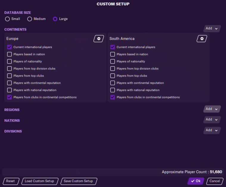 From here, you can choose to load all players from specific continents, regions and nations who meet certain criteria. For example, you may want the game to load all current international players from Europe or South America. You can also load all players based in certain divisions – even unplayable ones.