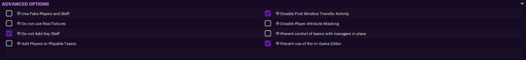 - Do not Add Key Staff: Usually, which don’t have key backroom staff members (e.g. an assistant manager) will be given newgen staff members at the start of the game. Ticking this option, however, will not add key staff to these teams. If you’re starting at an obscure club, you might want to leave this option alone.