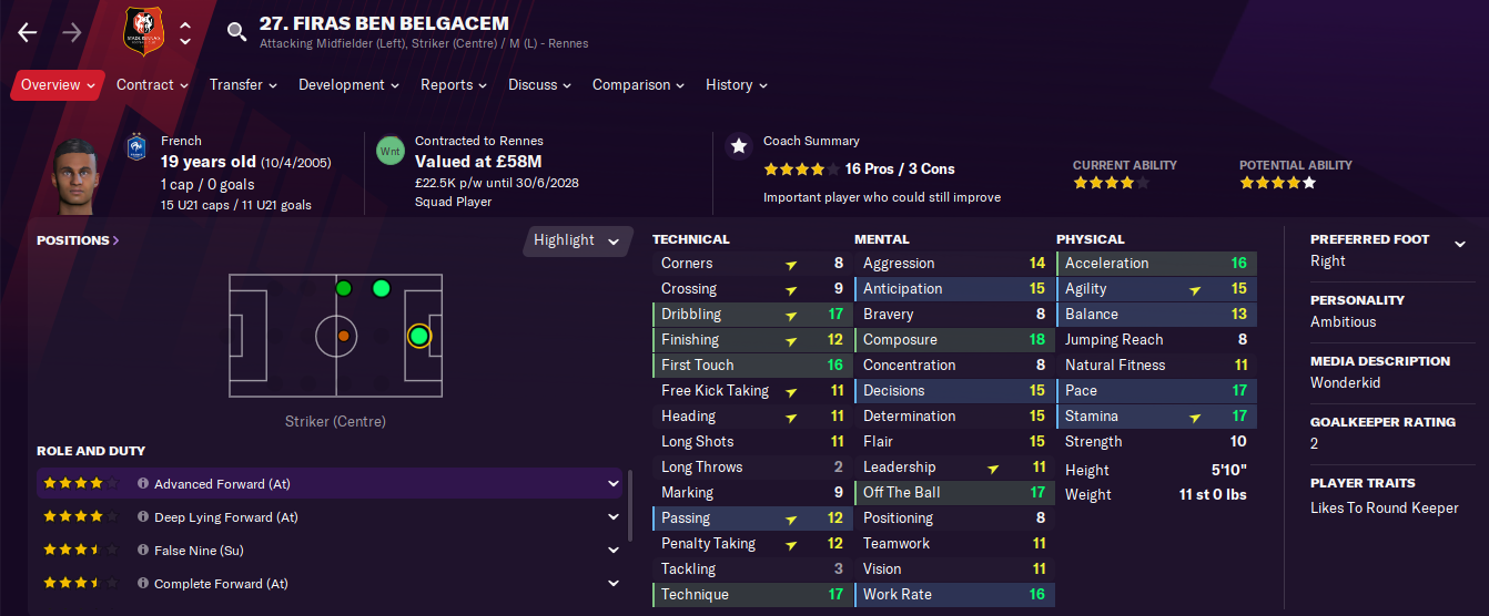 Look at my wonderkid striker from my Rennes save. Firas Ben Belgacem might ‘only’ have 12 Finishing, but he’s a fantastic dribbler, has ice-cool composure, is superb off the ball… and he’s rapid, which allows him to round the keeper more easily. In the season we won the French double and reached the Champions League Final, he scored 25 goals in all competitions – as a teenager.