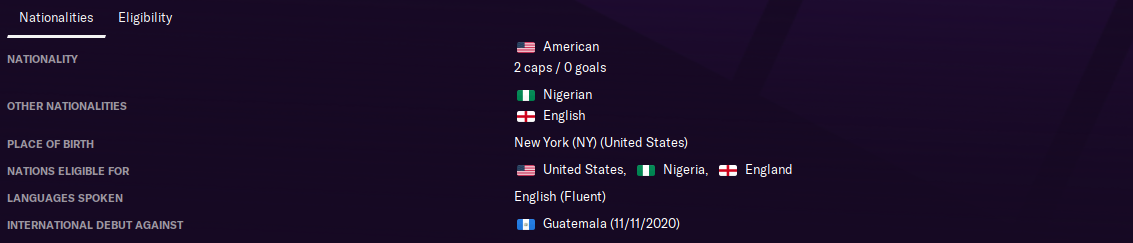 Unsurprisingly, this new rule is active on FM21. In the example above, Arsenal’s young forward Folarin Balogun has won two caps for the United States, debuting in a Gold Cup qualifier against Guatemala. However, as Balogun is still only 19, hasn’t yet made four competitive appearances for Team USA, and hasn’t yet featured in a major tournament, he is still eligible to play for England or Nigeria.