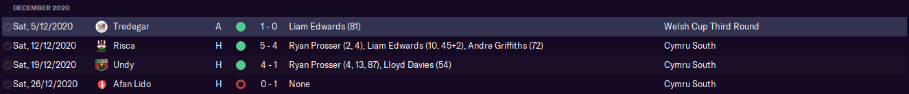 We endured a rough start to December, only barely getting past non-league Tredegar in the Welsh Cup. It took us 81 painful minutes to break the deadlock through our saviour-in-chief Edwards before we booked our place in Round 4 – the Last 16 stage. If there were any positives to take out of that, we kept our first clean sheet in nearly three months, and our new signing enjoyed a solid debut in midfield.
