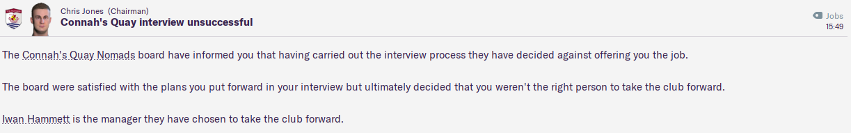 Laughable! They take FOUR WEEKS to reply, and then they chuck my application in the bin because I’ve “never guided teams away from relegation”! Erm… I think finishing 26 points clear of the drop should tell them all they need to know!