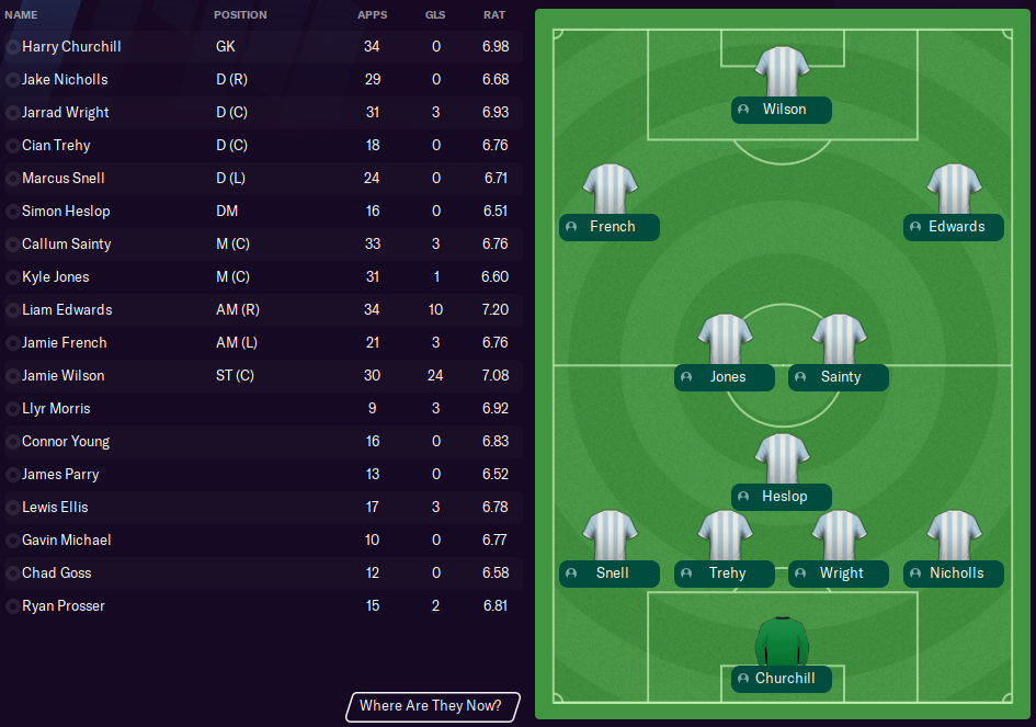 Of course, an average rating below 7 doesn’t make a player rubbish. I’m still very happy with Churchill’s performances in goal and Jarrad Wright‘s in defence, while Sainty has been a useful ball-winner in midfield for us. I probably expected a bit more from our new full-backs, along with Kyle Jones and Heslop in midfield, but I suspect the ratings algorithm might be a bit wonky when it comes to those positions.