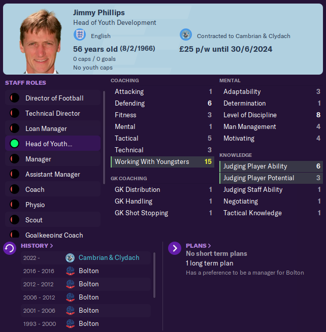 Our backroom staff is largely unchanged from last season, except we’re now on our THIRD Head of Youth Development in as many years. Our previous one flat-out refused to sign a new contract, so I brought in former Bolton defender and academy manager Jimmy Phillips instead. Jimmy’s on a two-year deal, so there’s no risk of him leaving next summer. Probably.