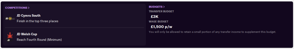After finishing 6th and 4th in the last two Cymru South seasons, the board now expect us to break into the top three this time around. Of course, I’m very much aiming for the title – and promotion to the Cymru Premier.