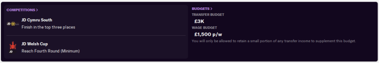 The League Cup might have gone, but the Welsh Cup still offers us the chance of a cup run. The chairman would like to see us get to Round 4, like we did a couple of years back. That’s definitely possible, as long as the draws are on our side and I don’t blindly play a 4-4-2 against a 4-3-3. (That loss to Haverfordwest last season will take a long time to forget…)