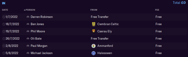 And so here are the six fellas I’ve brought in so far. Again, I’ve put most of my focus on adding more depth and experience to our defence, as we’re already pretty strong in midfield and further forward.