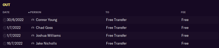 Backup goalkeeper Neil Collins retired in the summer aged 38, and he was one of four originals to leave the club. Connor Young had two solid seasons at centre-half but was too suspect under pressure. Right-back Chad Goss and attacking midfielder Joshua Williams hadn’t developed as well as I’d hoped.
