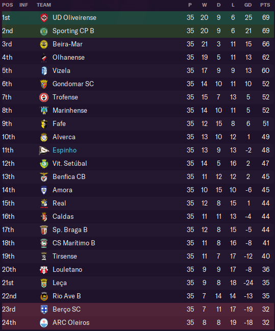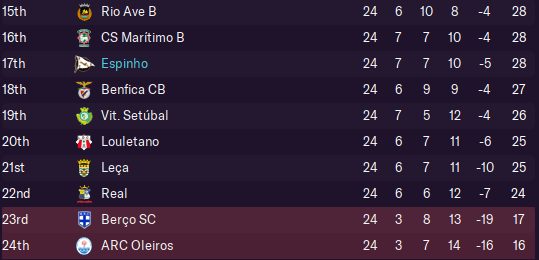 After that, we travelled to second-from-bottom Berço – and adopted the novel tactic of letting our opponents score first, so that we didn’t have a lead to throw away! However, our opponents took 69 minutes to break through, leaving us with not much time to fight back. With Pereira having a rare off day as well, we slumped to a fourth straight defeat – and fell to fourth-from-bottom.