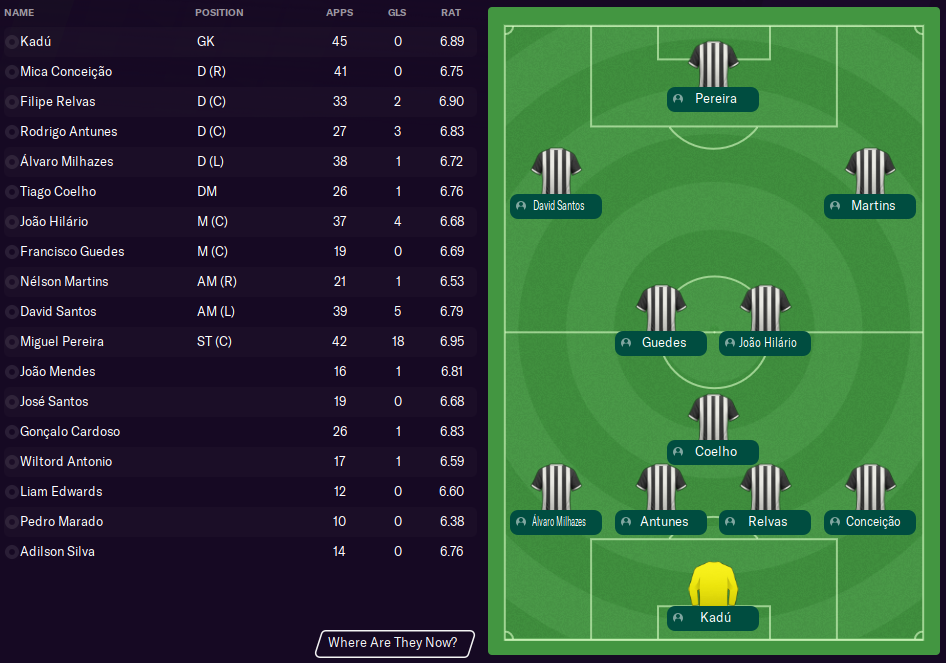 Defensively, we were actually quite solid, conceding as few goals as champions Beira Mar. One of the main reasons behind that record is vice-captain Kadú, who has been ever-present in goal for me so far. The Angolan has the odd blips (not least at Marinhense, where his injured shoulder was hampering him so much that I subbed him off at half-time) but is otherwise a very reliable shot-stopper.