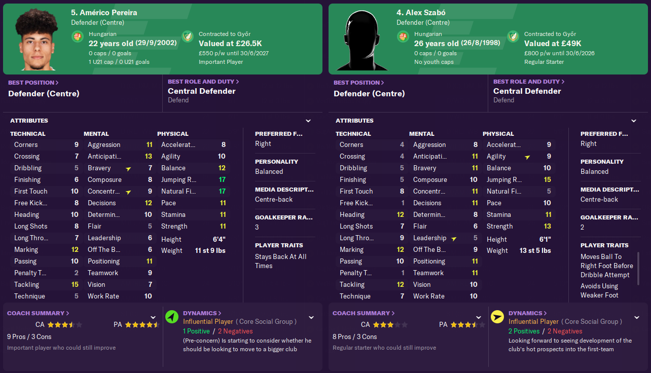 Like Szabados, Américo Pereira is a homegrown 22-year-old who forms a key part of our defence. The centre-back – who is of Brazilian descent – is an imposing aerial threat if a little shaky mentally. He’s also rated as a “decent player for most NB I sides”, and I’ve already turned down a £100,000 offer from a first-division club for his services.