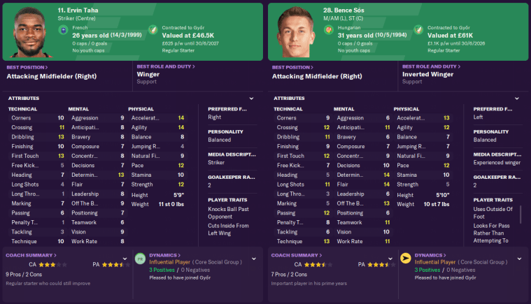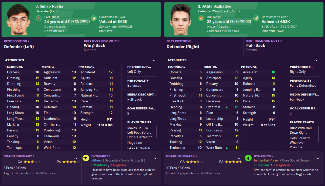 While I didn’t have a great relationship with Simão Rocha at Espinho, I still rate the left-back very highly. He’s got a very solid spread of attributes with few glaring weaknesses, and at 24, his best years are surely still to come. Hot on his heels will be fellow summer signing Barnabás Nagy, who’s a bit quicker if not quite as technically gifted.