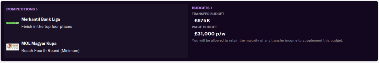 After languishing in mid-table for two straight seasons, the Győr board want to see an immediate improvement under my stewardship. They don’t expect promotion straight away, but a top-four finish will suffice. I suspect that even 5th or 6th might be acceptable if we’re at least putting up a good fight.