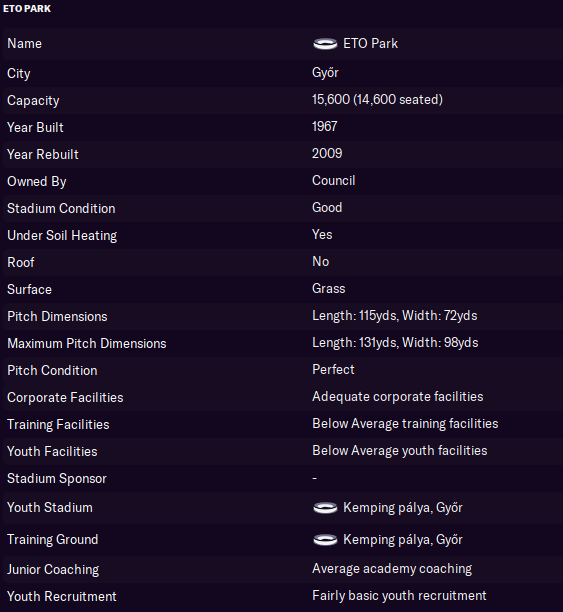 The latest stop on my managerial tour is ETO FC Győr. I think it’s pronounced something like “gjur”. I’m not a linguist, though, so if there are any Hungarians reading this, please feel free to correct me.
