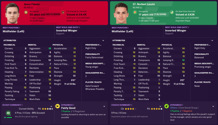 Lastly, I spent a good few weeks scouring for a left inverted-winger. I originally struck a deal to take one of Honvéd’s reserve players on loan. That was when I discovered that they had a 17-year-old Hungarian Under-21s international in their first-team who looked even better – and was “very interested” in joining us.