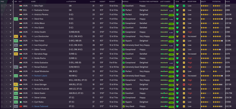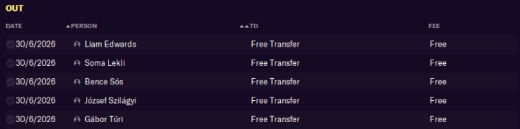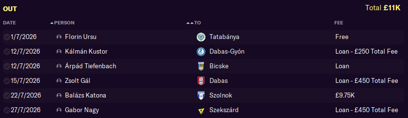 He’s not on this list, because the transfer technically happened last season, but we’ve sold Roland Hajdú. The creative but lethargic attacking midfielder didn’t want to leave us, so he took some persuading before he eventually joined Neftekhimik in Russia for £10,000. That’s probably too low a fee for a player of Roland’s abilities, but he wasn’t in my plans anymore and I just wanted him out.