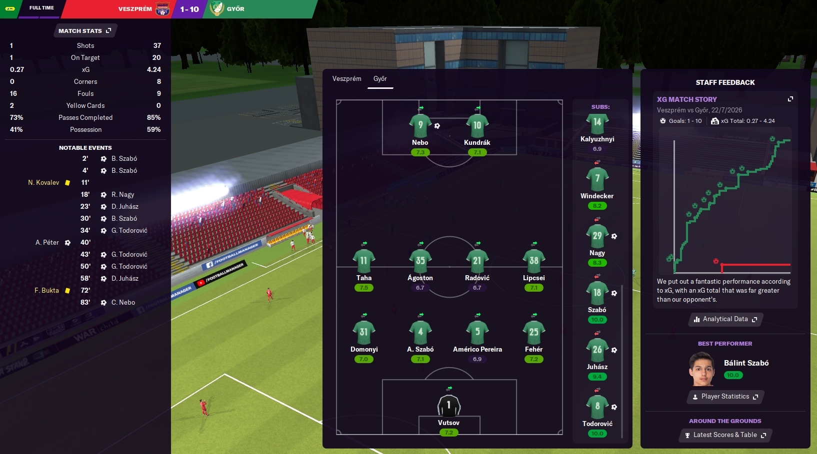 And then the fun really began, as we smashed TEN goals past third-division Veszprém. Bálint Szabó completed a hat-trick inside the first half-hour, and Todorovic also netted three, while even Juhász got a couple of goals! I was a little annoyed that Veszprém managed to score from their only attack, but that’s basically a first-world problem…