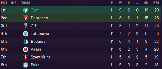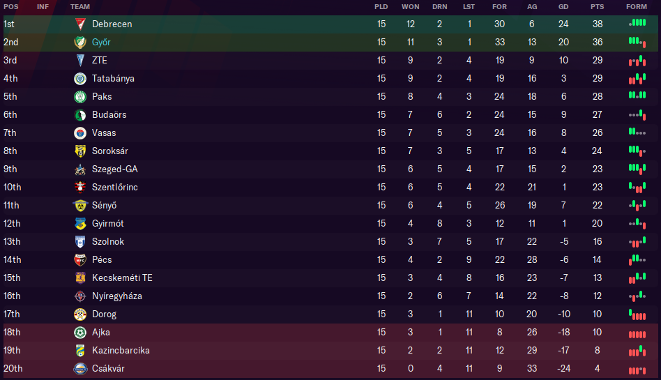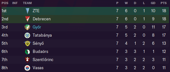 We then packed in another two-goal win, seeing off Paks to move up to 3rd place. László came off the bench to set up the second goal for striker Cyril Nebo, after Bálint Szabó had opened the scoring. Sadly, Bálint then strained a hamstring and was ruled out for three weeks, while left-winger Ervin Taha faced a lengthier absence with a partial ACL tear.