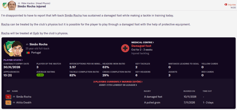 …until our backup right-back Attila Osváth tore his ACL and was ruled out for two months. That left us light on cover for our regular starter Attila Szabados. The next men in line were 19-year-old Tibor Fehér (who’s better as a centre-back) and 18-year-old Lajos Lipcsei (who’s played just one league game).