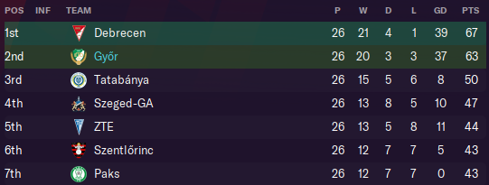 And so, with nine games to go, this is how the table looks. The championship has probably gone to Debrecen, who’ve won 10 of their last 11 games. Even automatic promotion is starting to look a little uncertain for us, as although we still hold a 14-point lead over ZTE in 3rd, our ropey recent form doesn’t inspire me. We could still blow this!