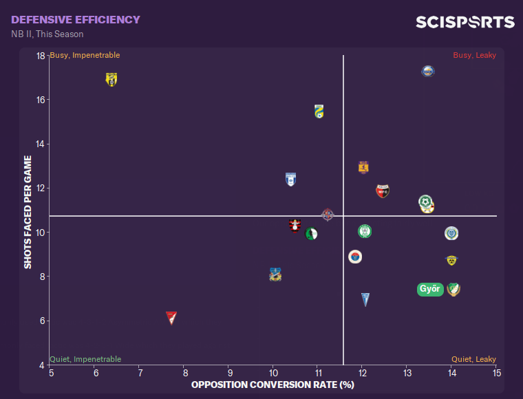 As impressive as our firepower was, though, it merely distracted from the defensive issues we had. Though we had fewer shots against us than anyone else except Debrecen and ZTE, our opposition conversion rate of 14% was the highest in the NB II. In other words, we expect to concede one goal for every seven shots we face.