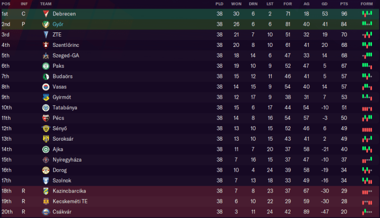 Things got quite ropey in the last few months, but we finished the season on 84 points – 14 more than ZTE. We were also the league’s top scorers by some distance. It’s just a shame about the defence…