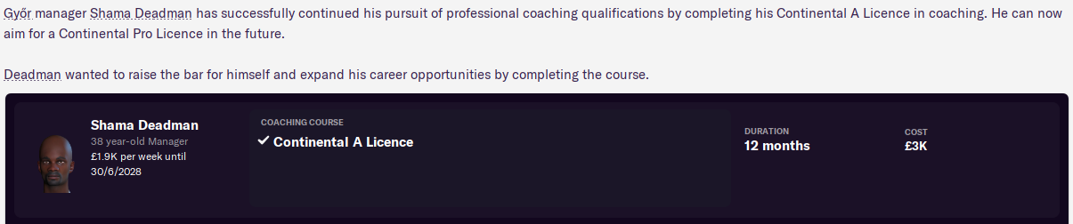 The UEFA Pro Licence is that final step, which would allow me to manage anywhere – in theory, anyway (Manchester United have just sacked Ole Gunnar Solskjær, but I doubt they’ll ask me to replace him). But that A Licence is enough for Hungary’s top division, and it makes more sense to fully focus on coaching my team right now rather than start another course immediately. The Pro Licence can wait.