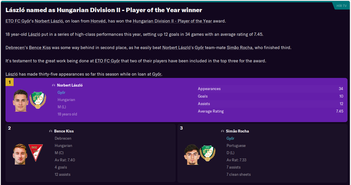 László’s excellence was recognised, as he won NB II’s Young Player of the Year AND Player of the Year awards. He was also one of three Győr players named in the Team of the Season, along with Rocha and Nebo.