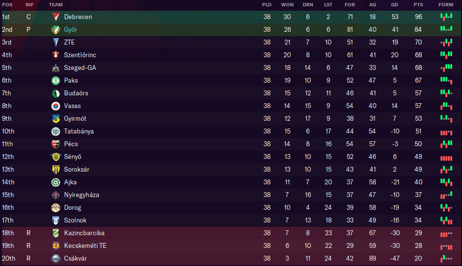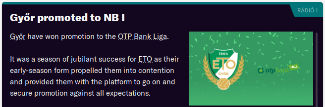 We did at least finish the season strongly, beating local rivals Gyirmót at home. Departing winger Bálint Szabó scored a stunner in his final match for Győr, before Nebo finished the campaign with a 23rd league goal. Sadly, our hopes of a first clean sheet since early March were dashed when young defender Tibor Fehér conceded a last-minute penalty, but ah well.