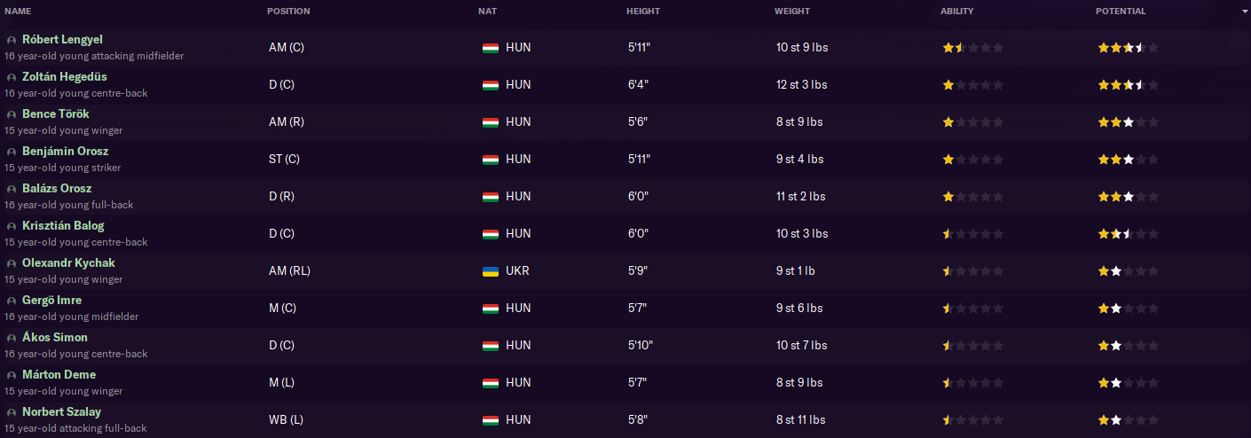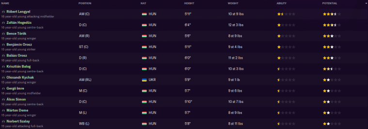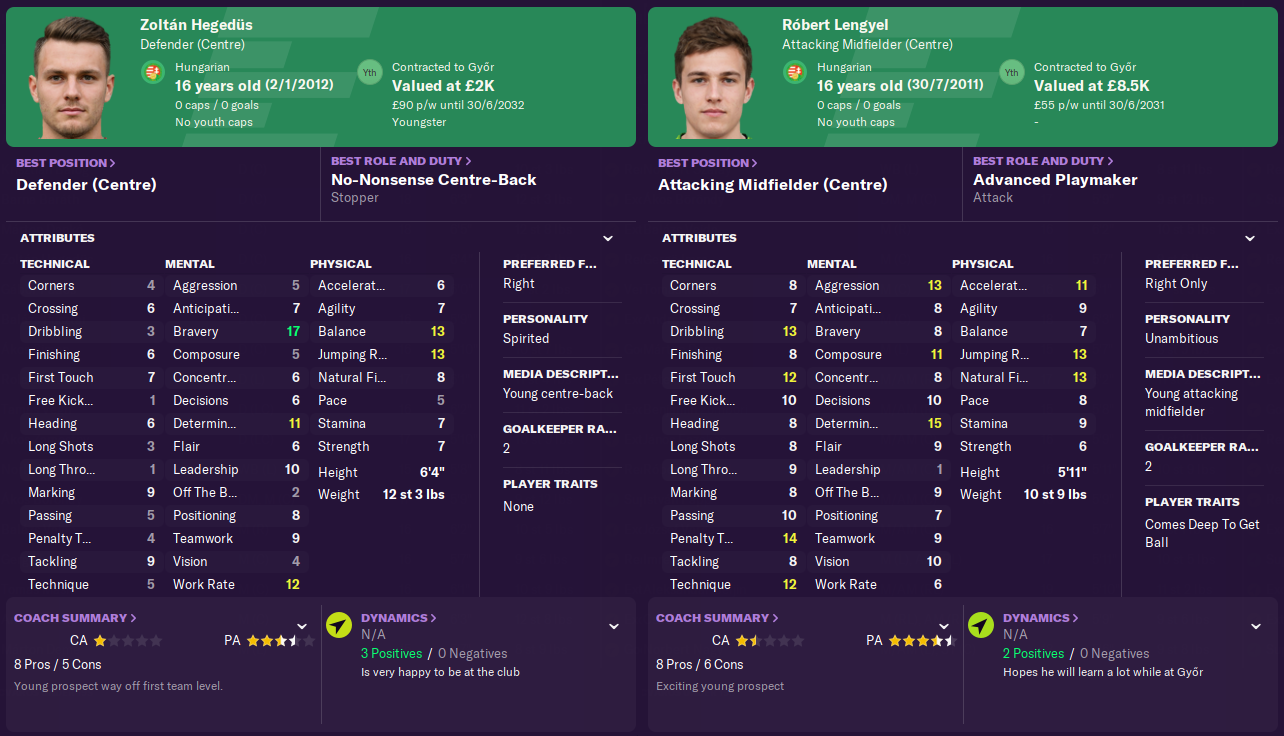 Zoltán Hegedüs is a very brave central defender, and I love his spirited personality, though he is very slow and will have to improve on his heading. Róbert Lengyel looks like a more exciting prospect in attacking midfield, already having high scores in Dribbling, First Touch and Technique. Lengyel’s one real downside is his low Ambition, which could really stall his development.