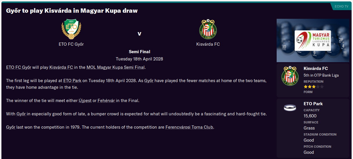 Part 31 took us through the first half of the 2027/2028 season, which marked Győr’s return to Hungary’s top division after a six-year absence. It really could not have gone much better, thanks largely to an English goal machine who has already built a strong following at ETO Park!