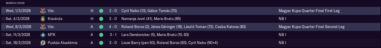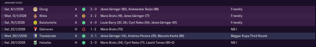 Before that, though, was a hard-fought 2-1 win at lowly Mezőkövesd. The first half could not have gone much worse, as a dominant Kövesd won a penalty (which Demjén saved) before eventually breaking the deadlock close to half-time. After I gave my players some stern words at the break, they managed to turn things around, as substitute Jović’s low cross was converted by Toman before Barry’s late penalty made it 2-1.