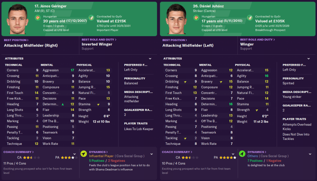 Géringer has been reasonably productive on right-wing, though his development has slowed lately, and his lack of natural fitness or killer instinct may stop him from progressing much further. I also have major concerns about Dániel Juhász, who has had another injury-blighted season and only played eight senior matches. There’s still plenty of time for the striker to rebuild his lost technical skills, but he really needs to toughen up first.