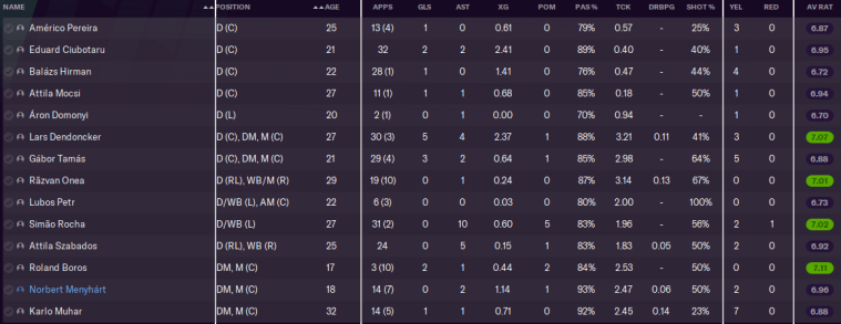 The goalies were arguably the biggest reasons why we conceded only 32 league goals – fewer than any other team except champions Ferencváros. Our defenders’ performances were decent if not amazing, though there was one clear weak link. Worryingly, that man was our new captain – centre-back Balázs Hirman, whose average rating of 6.72 stuck out like a sore thumb.