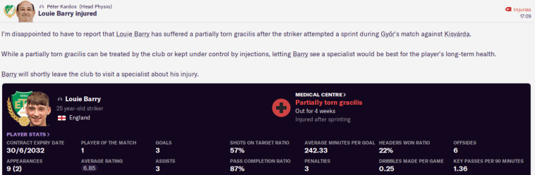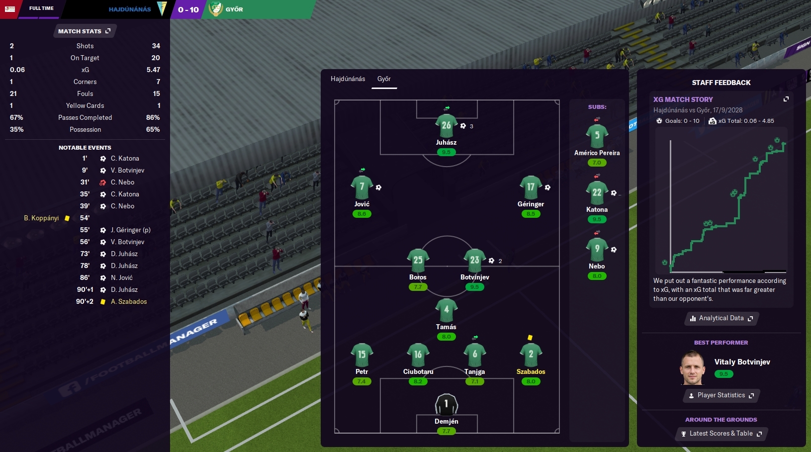 Meanwhile, Kovács produced yet another sublime shutout, making EIGHT saves on his way to an 8.2 rating! Then, with impeccable Deadman’s law timing, George suffered a back strain in training, which meant Patrik Demjén would have to replace him in goal for the next two fixtures.