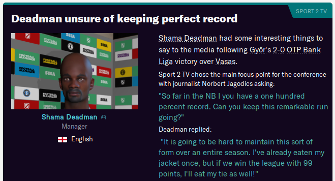 In the 2028/2029 season preview, we met several new signings – including a certain bear-hugging Russian – who Shama hopes will take his Győr team to that next level. We also saw how they got on in their first two qualifying matches for the Europa Conference League (spoiler: not very well).