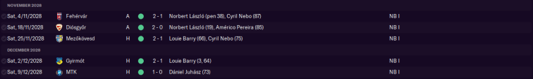Barry then came to life by scoring in our next three games, starting with another narrow home win over Diósgyőr. King Louie wasted another penalty at newly-promoted city rivals Gyirmót, but then kicked off a late surge that got us through. He finally banished his spot-kick demons at the third attempt to defeat the other NB I newcomers Vasas.