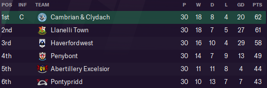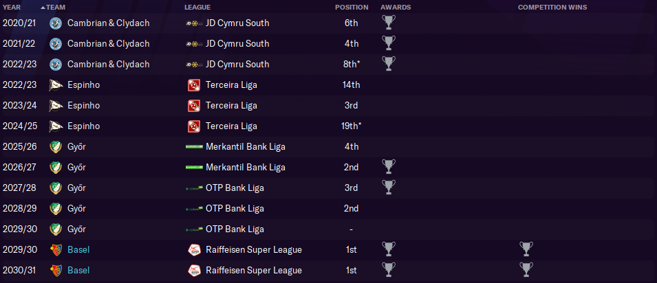 I left a decent legacy at my first club Cambrian & Clydach, who won promotion from the Cymru South after my departure midway through the 2022/2023 season. Cambrian lasted just one season in the Cymru Premier before being relegated, but they would return in 2028, only to go straight back down again.
