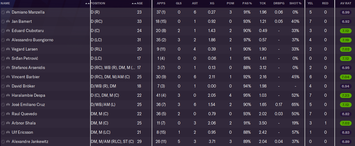 New goalkeeper Nesti was particularly excellent in Europe, where his cat-like reflexes and strong decision-making got us to the brink of the Europa League Quarter Finals. Surprisingly, he was a bit less dependable domestically – his 74% save ratio was actually only the 9th-best in the Super League (Köhn was 2nd, on 81%).