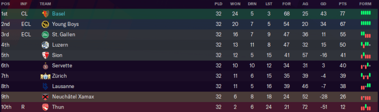 Our first game of the run-in was a potential decider against 2nd-placed Young Boys, who had beaten my Basel team in all my previous three visits to the Wankdorf. If we changed that and came away with at least a point, we’d be confirmed as champions with three games to spare. If not, YB would be back to within seven points.