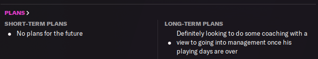 Any player aged 29+ will have a long-term plan (shown on the Information page on their profile) which will give you hints about their future career. One player may be “seriously considering” going into coaching or management, while another may prefer another backroom role. Some players may even want to leave football altogether once they’ve stopped playing.