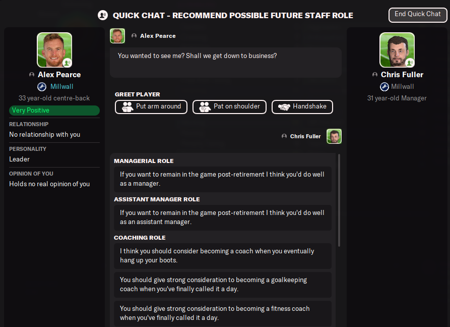 For me, a determined player with a strong personality – and perhaps high Leadership – would be a good candidate for a future coaching role. There is also a simple way to find out what a player wants to do when they retire…