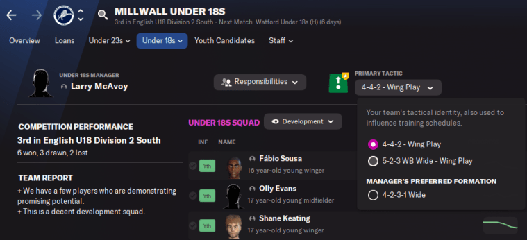 If you want your development teams to play the same tactics as your first-team, you can set this in your Development Centre. Doing this will override the manager’s preferred formation, though their other preferences can still impact the decisions they take in matches.