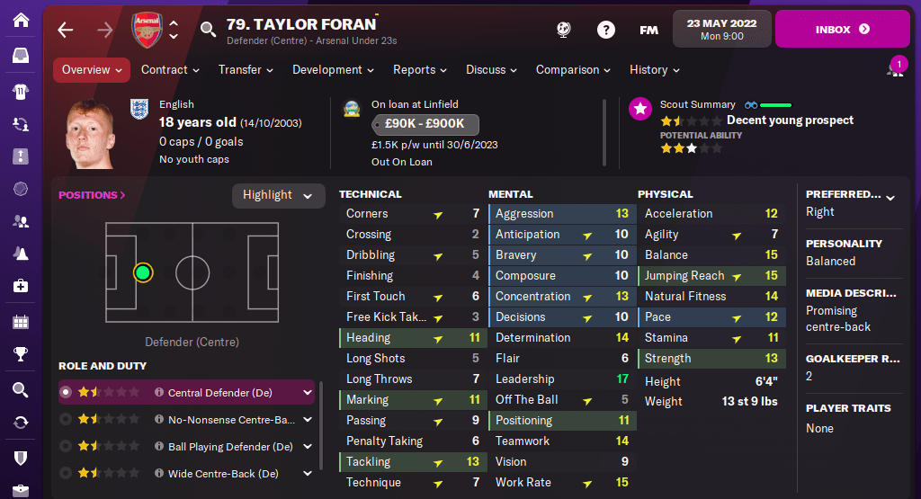 My first signing was Aberdeen’s homegrown right-back Calvin Ramsay, who has just joined Liverpool in real-life, but is apparently a boyhood Arsenal fan. Ramsay has very good technique and pace, and is adept with either foot. He went back to Pittodrie on loan for the rest of this season.