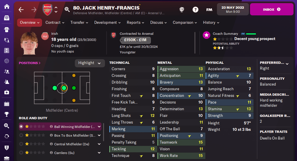 I love a hard-working ball-winner, and Jack Henry-Francis has impressed me enough to give him four cup appearances. I’m not yet convinced he’ll have the technical ability to be a first-team regular – and that ‘Dwells on Ball’ trait is a possible red flag – but maybe he’ll prove me wrong.