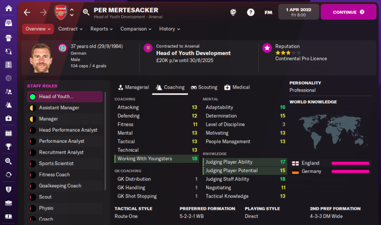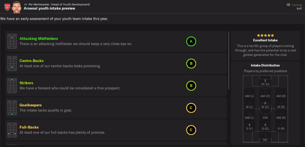 Let’s now look at our first youth intake. Arsenal start off with ‘Excellent’ youth facilities, ‘Excellent’ youth recruitment and ‘Exceptional’ academy coaching – and former captain Per Mertesacker is a quality Head of Youth Development with a strong personality. All those things should point towards a good intake, but there are never any guarantees.